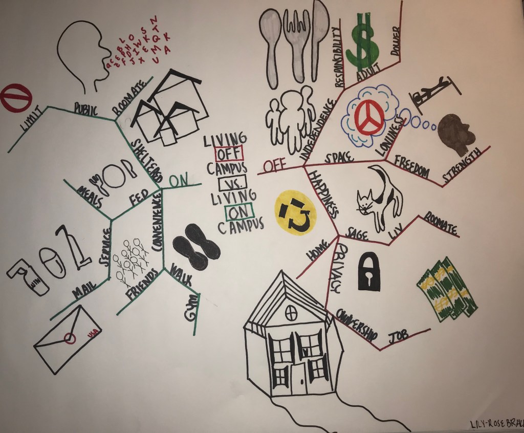 At the start of the map process, there was one thought that kept reoccurring in my head, so I deemed it most beneficial for me to write about. Something that has been laying around in my subconscious the decision to live on or off campus next year. When starting this map I was already leaning towards wanting to be off campus, but this thought process helped me through the steps of feeling reassured by my decision. The words flowed out, as many of my worries had correlations and were a result of each other.