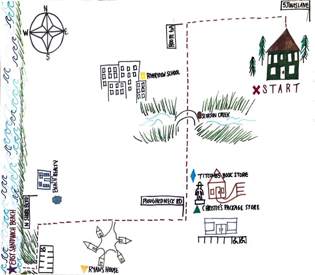 For this map I chose to draw directions from my house to East Sandwich beach. This is my favorite beach to go to in the summer because not to many tourists know about it, so it is mainly locals. This year the beach has become even more significant to me because my brother recently moved on the road that the beach is on with his girlfriend, which I depicted in the map. Some of the points that may be harder to recognize than others are the turns, but I tried to simplify the confusion by adding the street names facing where to turn. The struggle that I had with this map was reorganizing where the starting point was to have enough space for the other roads and turns. After playing around with pencil to sketch where everything should go, I decided to start in the top right corner because most of the turns were on the right hand side.
